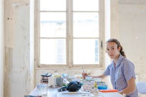 Raphaëlle Benzimra (born in 1999 in Paris) graduated from the École nationale supérieure des Beaux-Arts de Paris in 2023. That same year, she received the Bertrand-Demandolx-Dedons Portrait Prize. In 2022, she was selected for the Novembre Painting Prize in Vitry at Galerie Jean Collet. She is the recipient of the Encore! Foundation residency in La Rochelle and presented a duo exhibition with Clarisse Hahn at Galerie Jousse Entreprise in Paris in 2024. Her work is currently on view at MO.CO Panacée in Montpellier in the group exhibition L’Esprit de l’atelier, featuring students from Djamel Tatah’s studio at the École des Beaux-Arts de Paris, on view until May 3, 2026.