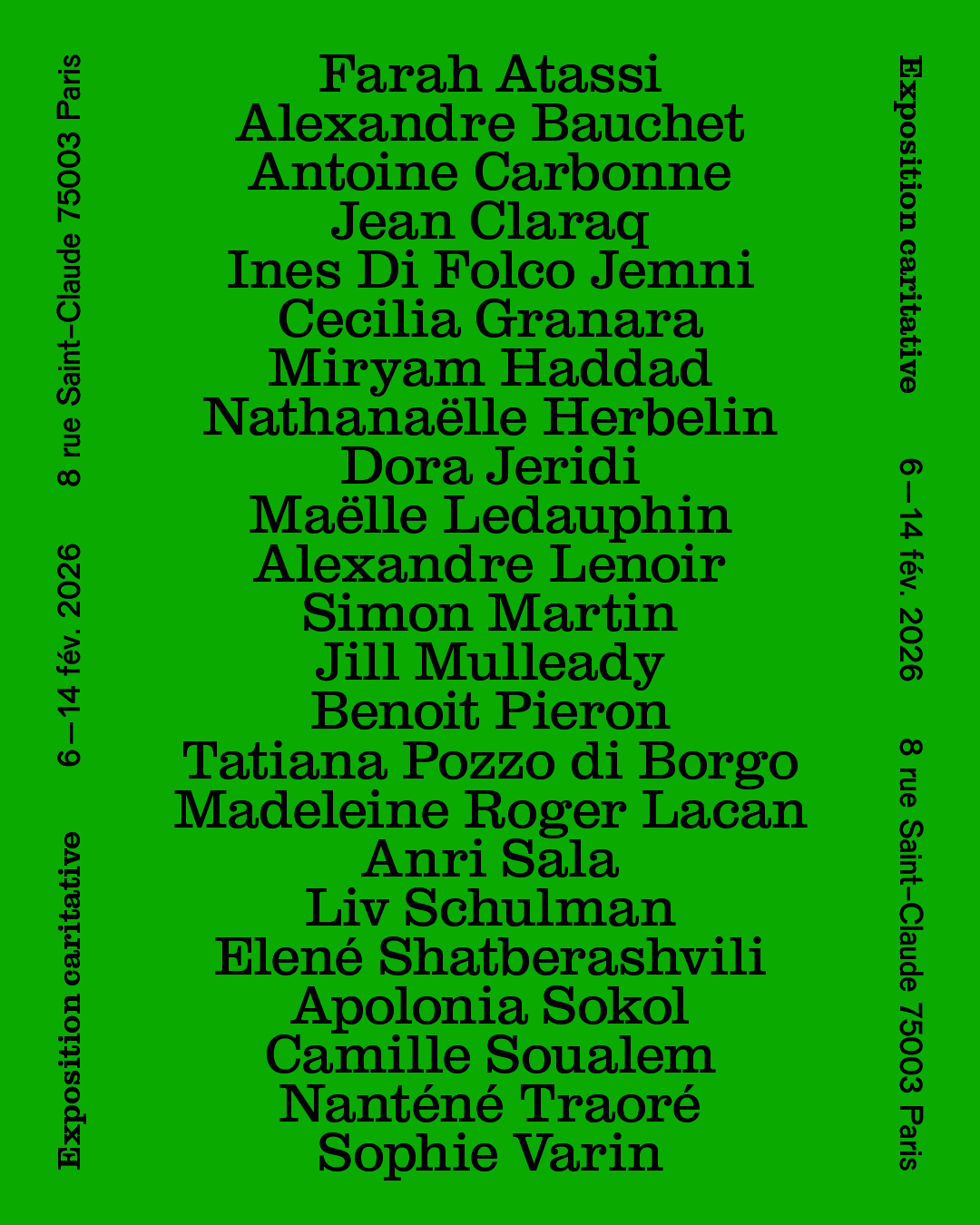 Un geste collectif de solidaritรฉ rรฉunissant une vingtaine dโ€™artistes de la scรจne franรงaise, qui reversent ร  lโ€™association les recettes de la vente de leurs ล“uvres : Farah Atassi, Alexandre Bauchet,ย Antoine Carbonne, Jean Claraq, Ines Di Folco Jemni, Cecilia Granara, Miryam Haddad, Nathanaรซlle Herbelin, Dora Jeridi,ย Maรซlle Ledauphin,ย Alexandre Lenoir,ย Simon Martin, Jill Mulleady,ย Benoit Pieron,ย Tatiana Pozzo di Borgo,ย Madeleine Roger Lacan, Anri Sala, Liv Schulman, Elenรฉ Shatberashvili, Apolonia Sokol, Camille Soualem, Nantรฉnรฉ Traorรฉ, Sophie Varin.