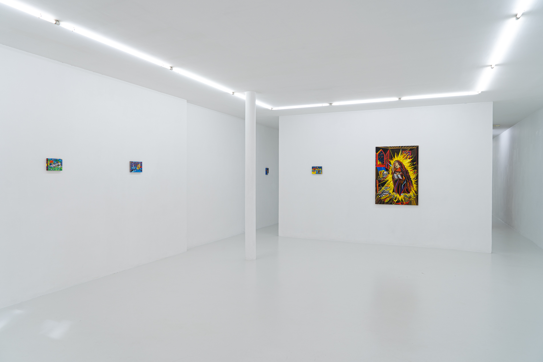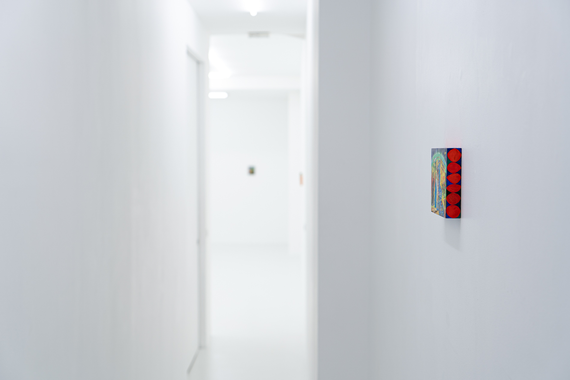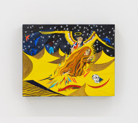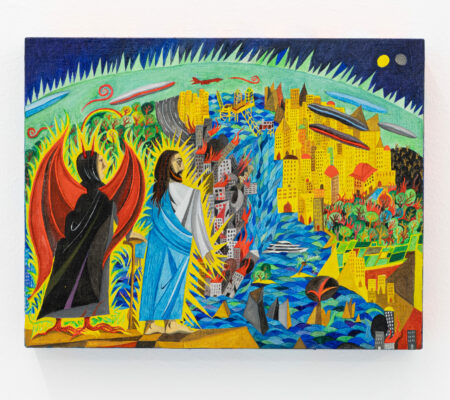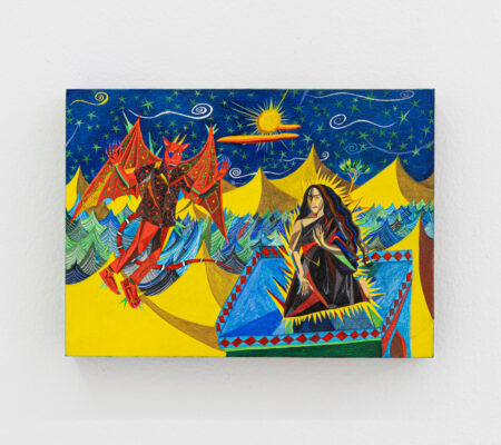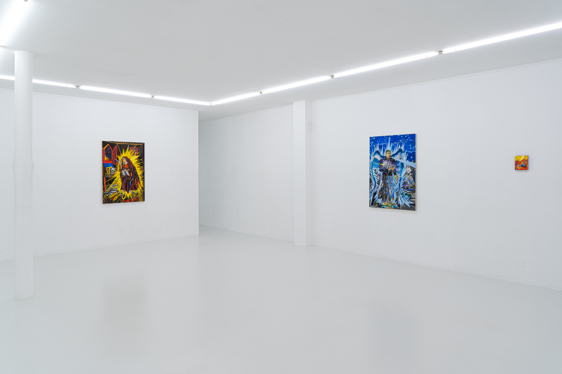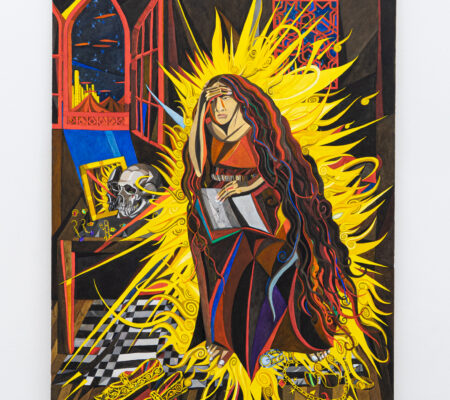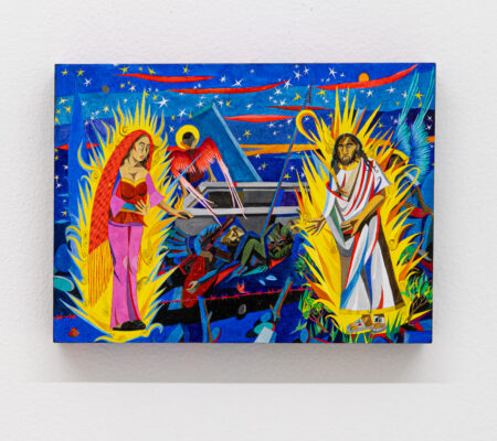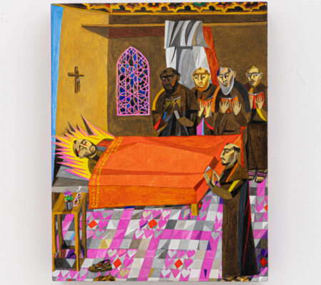 Most of the paintings gathered here are small in scale. They invite proximity: an intimate, almost tactile encounter, a kind of bodily engagement. Like an illuminated manuscript that one opens, closes, and returns to, they encourage meditation – the slow rumination of the image. One approaches, observing the cut surfaces of flat colour, the certainty and doubt in the faces, the iconographic attributes resurfacing from the past. One steps back, recognises a narrative, a memory and plunges into a dense symbolism, whether familiar or unknown. When one moves away from these paintings and then returns to them later, something has shifted – within them or perhaps within ourselves (it is no longer entirely clear).