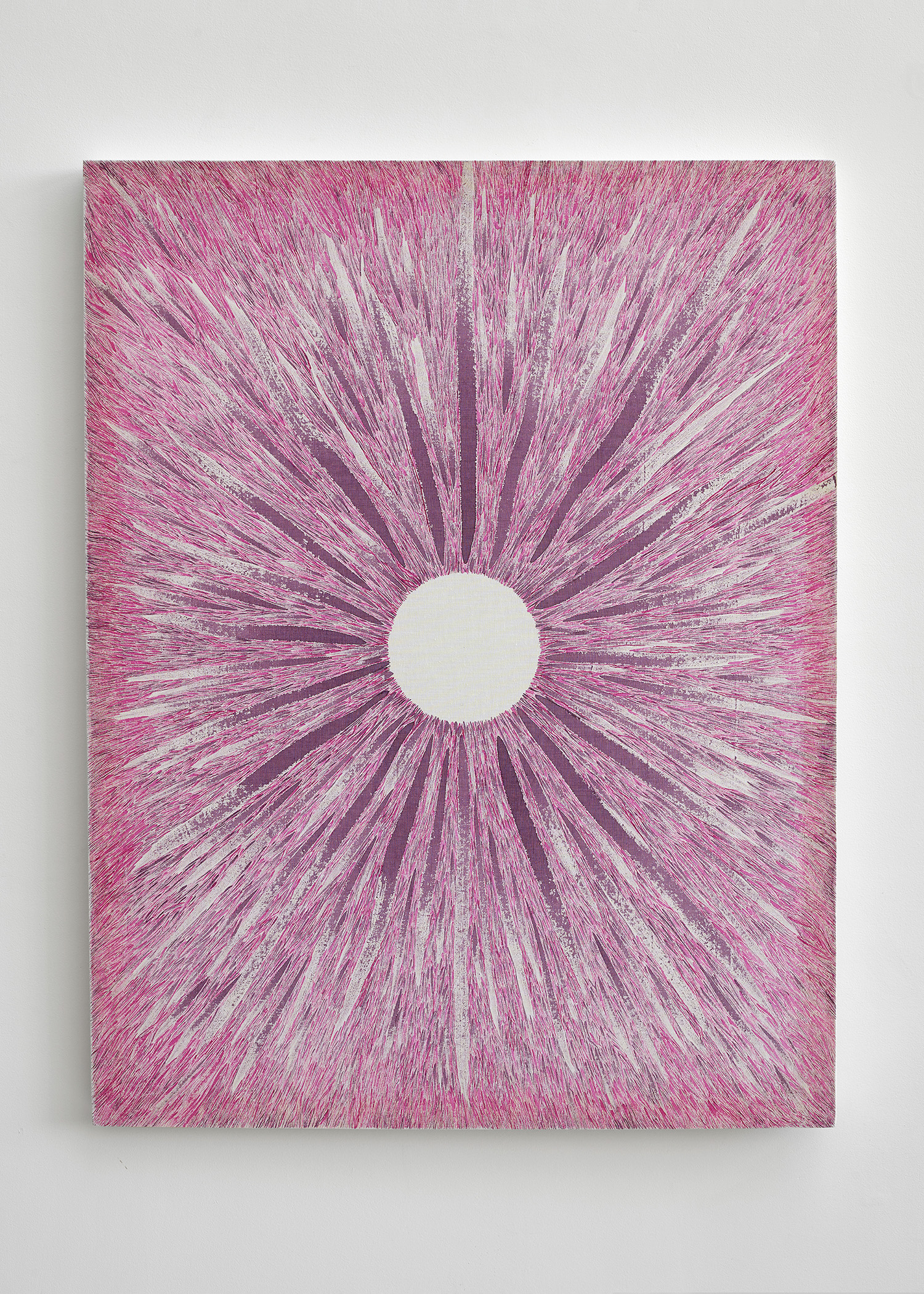 Beltrame made them in a state of extreme concentration. Working around a central, empty space, he rapidly drew straight lines, each in a single long motion. Using a brush, he paints other, increasingly short and thinner lines, often of a different colour, until the whole surface is covered. When the delicate fabric is stretched it becomes perfectly flat, enhancing the optical, vibratory effects of his work and emitting an energy that absorbs our gaze and pulls our body toward the centre.