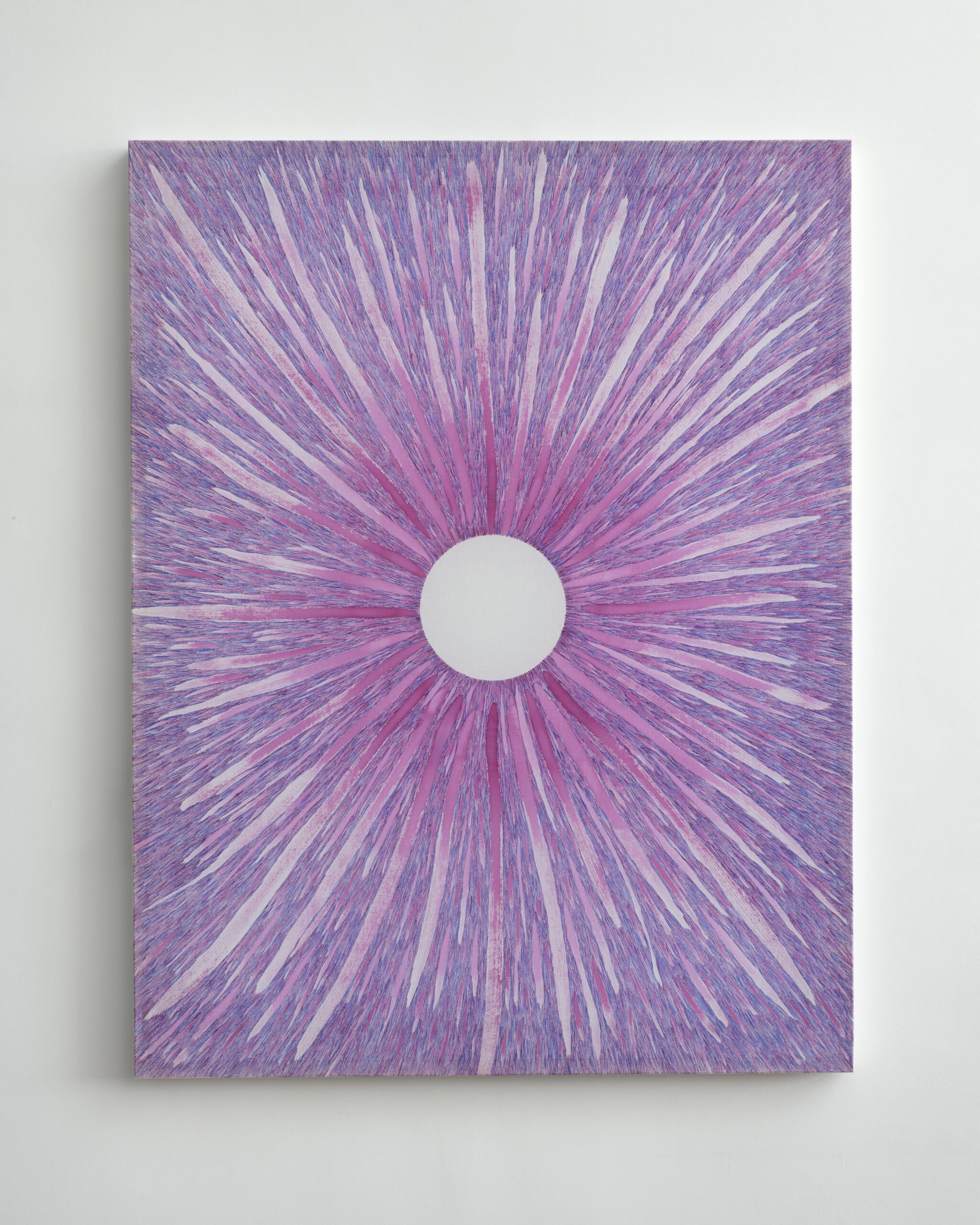 The vortexes on are made of ink on cotton voile mounted on a frame. Beltrame made them in a state of extreme concentration. Working around a central, empty space, he rapidly drew straight lines, each in a single long motion. Using a brush, he paints other, increasingly short and thinner lines, often of a different colour, until the whole surface is covered. When the delicate fabric is stretched it becomes perfectly flat, enhancing the optical, vibratory effects of his work and emitting an energy that absorbs our gaze and pulls our body toward the centre.