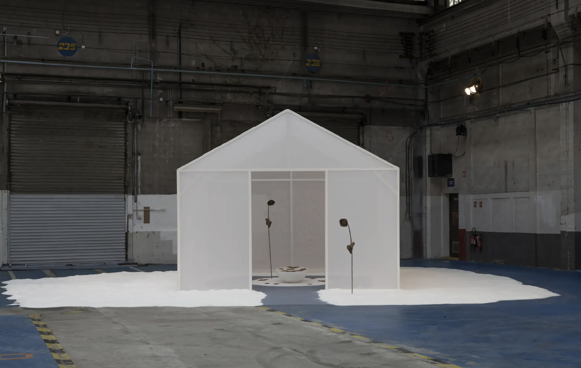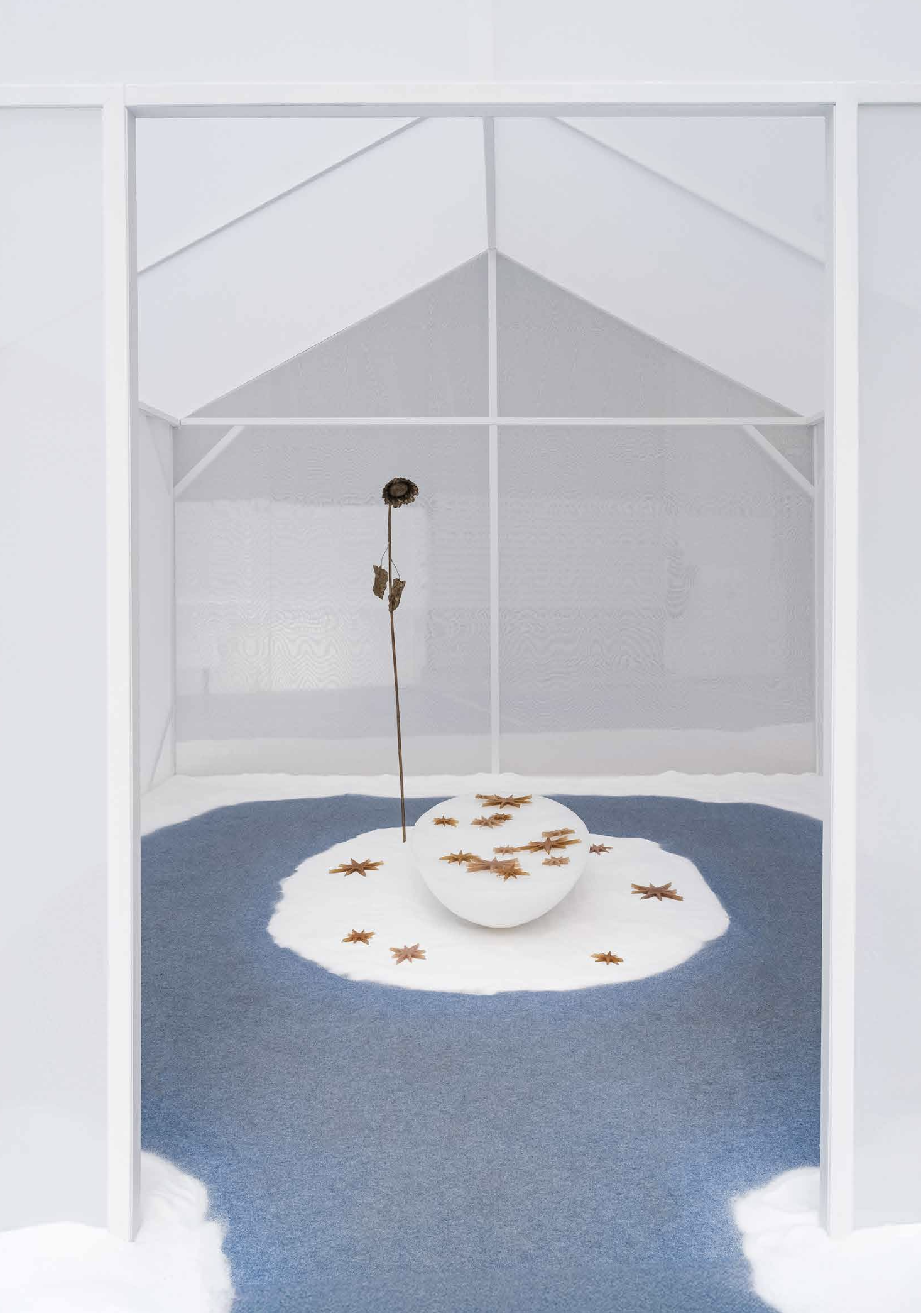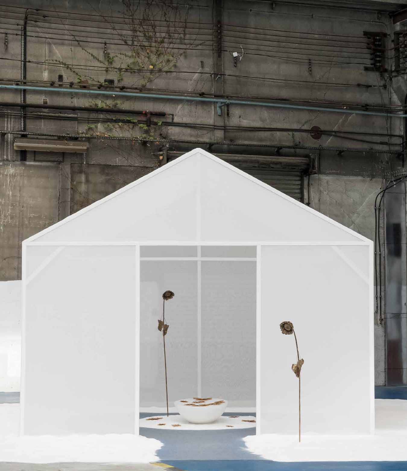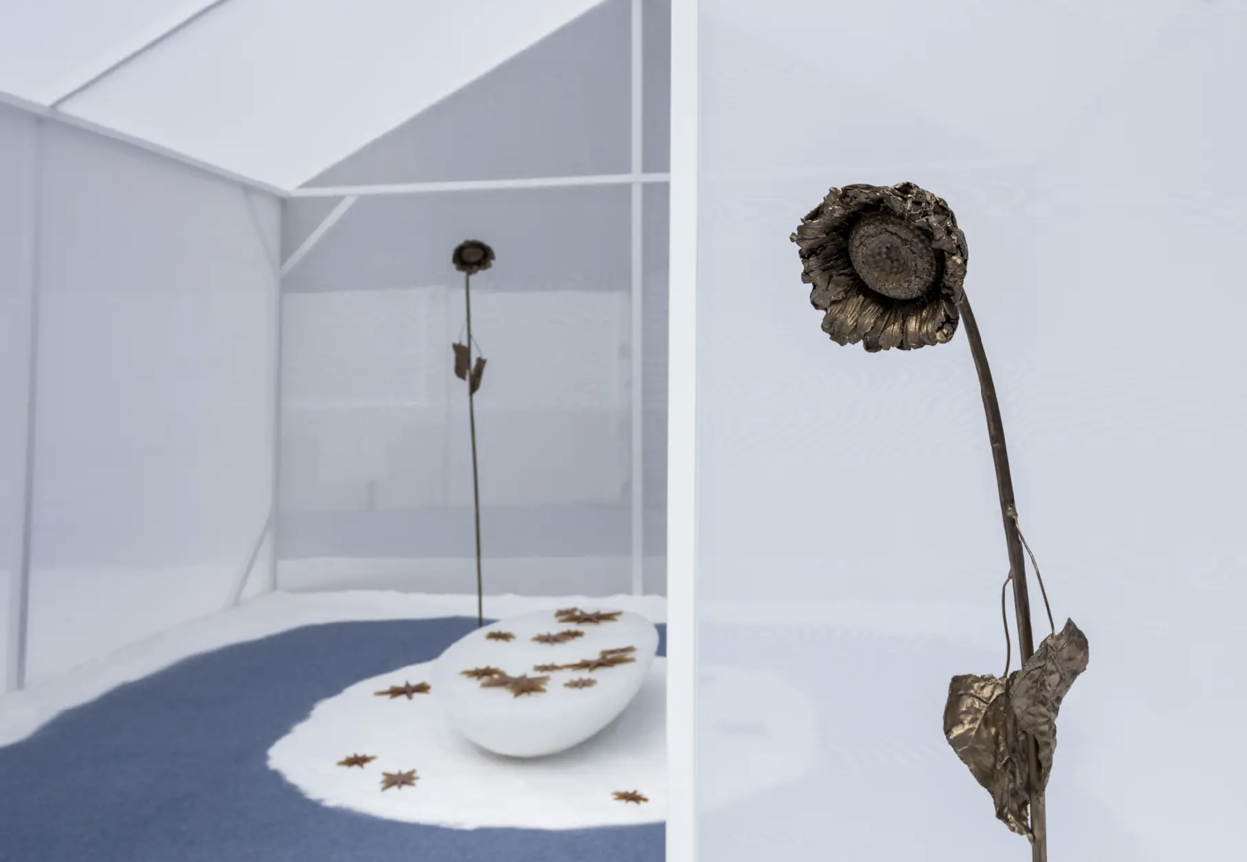 Inspirée par les premiers souvenirs de l’artiste liés au foyer familial, Nothing/Everything to remember (« Rien / Tout à retenir ») relève autant d’idées abstraites que de situations concrètes — franchir un seuil, trouver un abri, se sentir accueilli·e. Dans des usines ferroviaires autrefois vouées à la réparation, la maison de Victoire Inchauspé se veut être un espace de protection pour des existences fragiles et des âmes en peine. Rappelant les rites et pratiques funéraires antiques, la barque évoque une expérience personnelle et intime de la perte. Réduit à quelques fleurs fanées, le vivant se retire des lieux et invoque, par son absence, ce qui n’est plus. Lors de cette veillée, les tournesols se préparent à éclore et les étoiles s’apprêtent à scintiller, car Nothing/Everything to remember appelle à une forme de renaissance en initiant un voyage vers un autre monde.