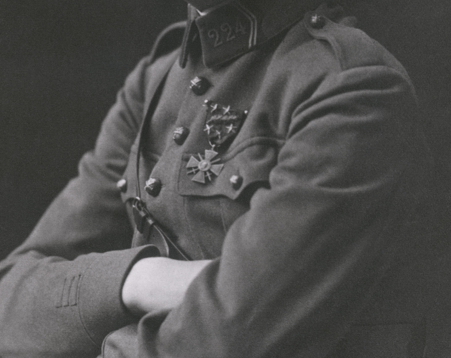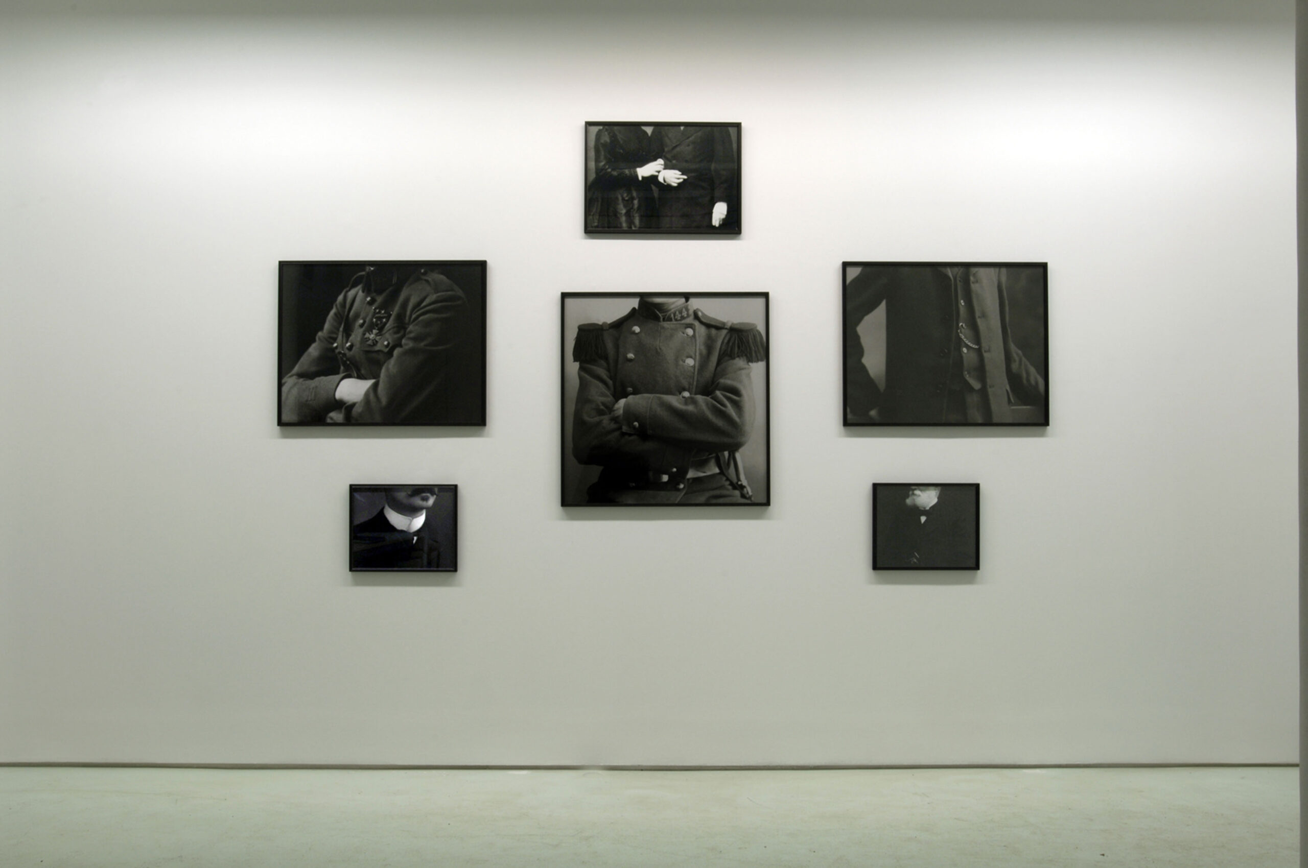 Cette série de photographies se base sur des portraits tirés des albums de famille des personnages du film LES PROTESTANTS, qui vivent au milieu des portraits de leurs aïeux, en y faisant constamment référence. On sent encore aujourd’hui dans leur corps la rigidité de ces portraits-modèles. Le recadrage et l’agrandissement des photographies radicalise l’intention des modèles: poser en établissant la plus grande distance possible avec l’intériorité. Ne laisser percevoir aucun détail qui pourrait permettre à un observateur de situer l’individu en dehors du rôle qu’il tente d’incarner: celui du bourgeois protestant austère, et quand il le faut, celui du militaire discipliné. C’est un idéal de beauté qui rime avec sobriété et contrôle de soi. La photographie met en question ce corps qu’elle révèle et masque simultanément. Les bras se croisent sur le torse, la veste du costume est raidie au point de ressembler à une cuirasse. Le corps devient frontière. il est au centre de la relation à l’autre, mais il se positionne comme un obstacle, une muraille protectrice. C’est la muraille elle-même qui laisse supposer à l’observateur les fragilités et les failles qu’elle tente de masquer.