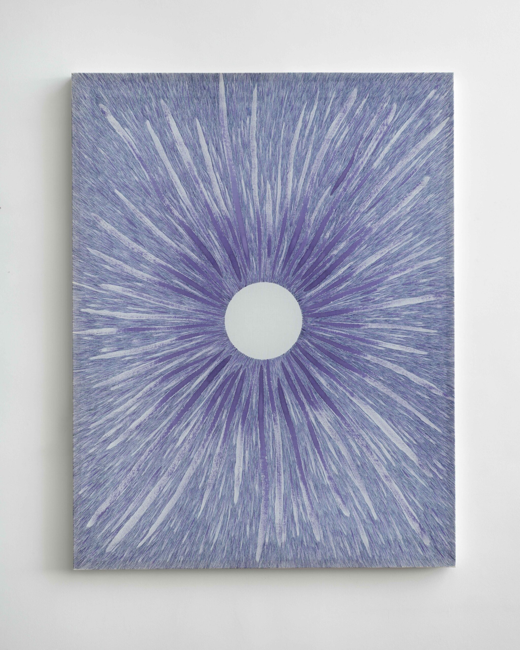 Les Vortex sont réalisées par Loudgi Beltrame dans un état de concentration. Autour d’un espace circulaire laissé en réserve, l’artiste effectue des gestes larges d’un seul mouvement droit et rapide. Des traits, progressivement plus courts et plus fins, souvent d’une deuxième couleur, sont appliqués au pinceau jusqu’à couvrir l’ensemble du voile. Le support délicat, une fois tendu, gomme tout relief et met en avant l’aspect optique et vibratoire de ces interventions desquelles se dégage une énergie qui absorbe le regard et le corps vers son centre.