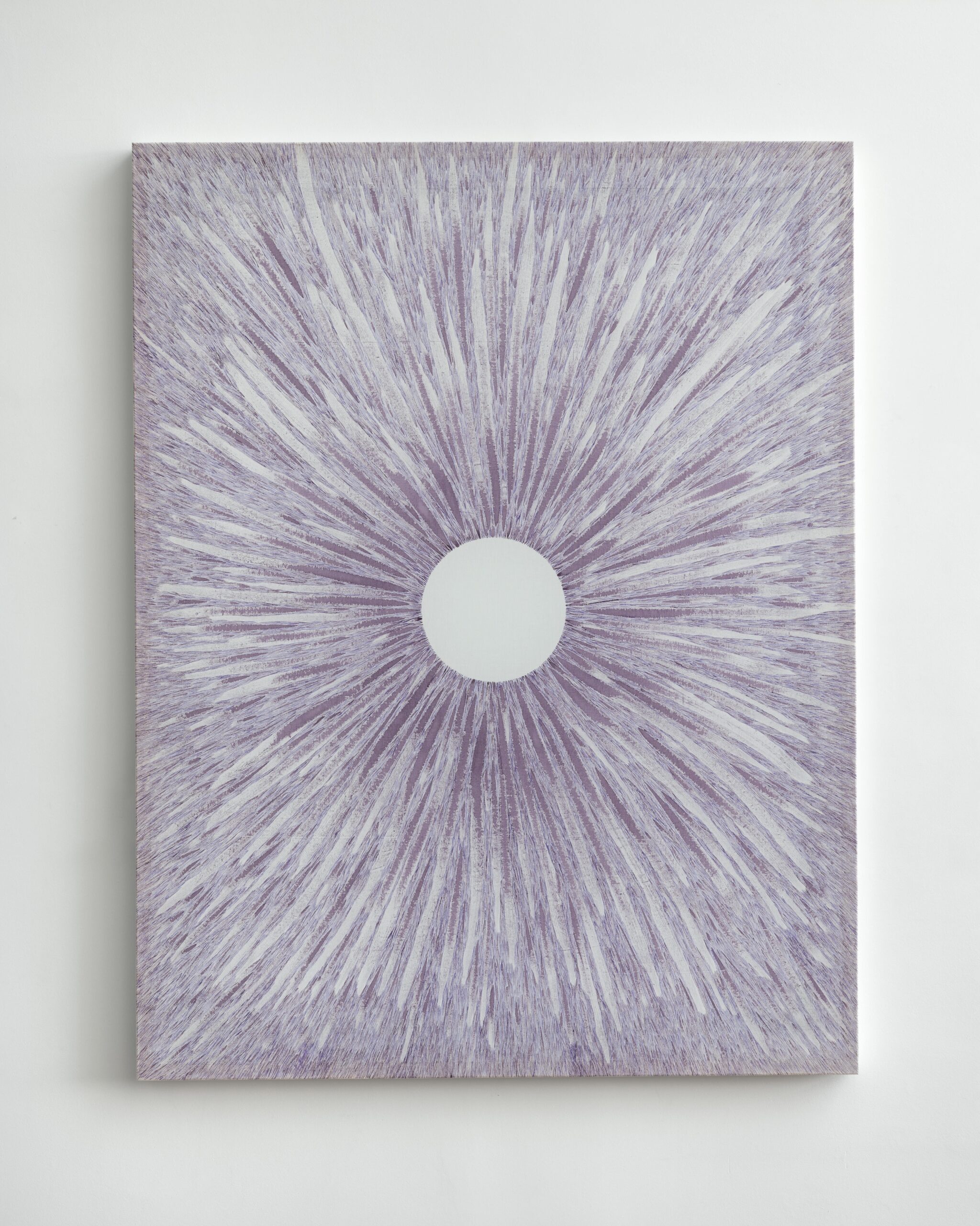 Les Vortex sont réalisées par Loudgi Beltrame dans un état de concentration. Autour d’un espace circulaire laissé en réserve, l’artiste effectue des gestes larges d’un seul mouvement droit et rapide. Des traits, progressivement plus courts et plus fins, souvent d’une deuxième couleur, sont appliqués au pinceau jusqu’à couvrir l’ensemble du voile. Le support délicat, une fois tendu, gomme tout relief et met en avant l’aspect optique et vibratoire de ces interventions desquelles se dégage une énergie qui absorbe le regard et le corps vers son centre. (Claire Le Restif, 2024)